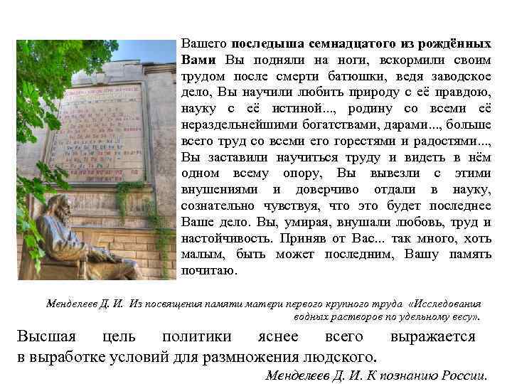 Вашего последыша семнадцатого из рождённых Вами Вы подняли на ноги, вскормили своим трудом после смерти батюшки, ведя заводское дело, Вы научили любить природу с её правдою, науку с её истиной. . . , родину со всеми её нераздельнейшими богатствами, дарами. . . , больше всего труд со всеми его горестями и радостями. . . , Вы заставили научиться труду и видеть в нём одном всему опору, Вы вывезли с этими внушениями и доверчиво отдали в науку, сознательно чувствуя, что это будет последнее Ваше дело. Вы, умирая, внушали любовь, труд и настойчивость. Приняв от Вас. . . так много, хоть малым, быть может последним, Вашу память почитаю. Менделеев Д. И. Из посвящения памяти матери первого крупного труда «Исследования водных растворов по удельному весу» . Высшая цель политики яснее всего выражается в выработке условий для размножения людского. Менделеев Д. И. К познанию России.