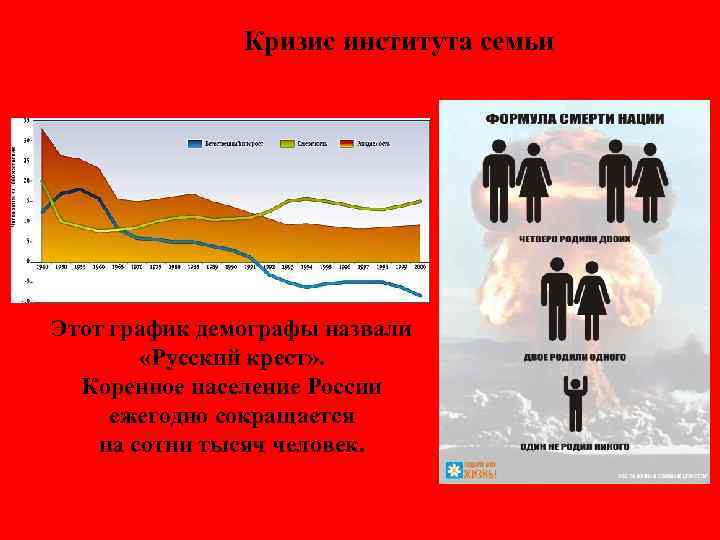 Кризис института семьи Этот график демографы назвали «Русский крест» . Коренное население России ежегодно сокращается на сотни тысяч человек.