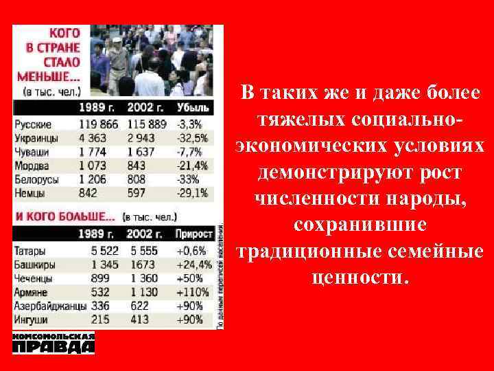 В таких же и даже более тяжелых социальноэкономических условиях демонстрируют рост численности народы, сохранившие традиционные семейные ценности.