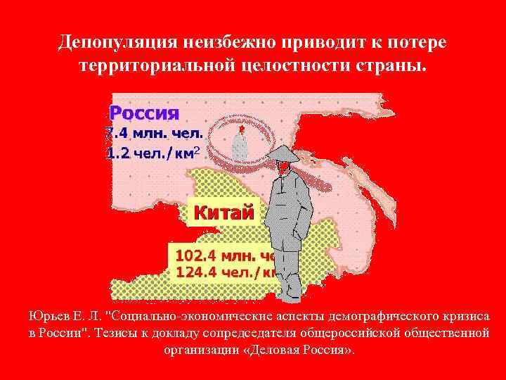 Депопуляция неизбежно приводит к потере территориальной целостности страны. Юрьев Е. Л. "Социально-экономические аспекты демографического кризиса в России". Тезисы к докладу сопредседателя общероссийской общественной организации «Деловая Россия» .