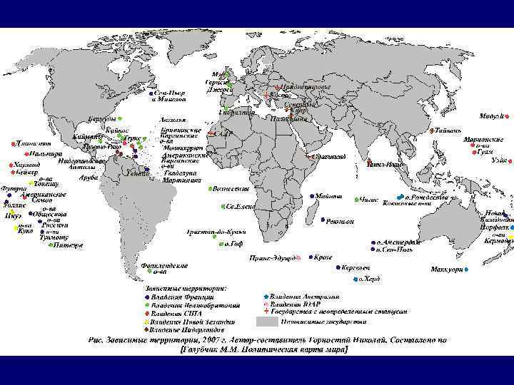Колонии по списку ООН, 2007 г. Великобритания: Гибралтар, Святой Елены, Бермудские о-ва, Виргинские о-ва, Ангилья, Монтсеррат, Каймановы о-ва, Тёркс и Кайкос, Фолклендские о-ва, Питкэрн Франция: Новая Каледония США: Виргинские о-ва, Гуам, Американское Самоа Новая Зеландия: Токелау Марокко: Западная Сахара