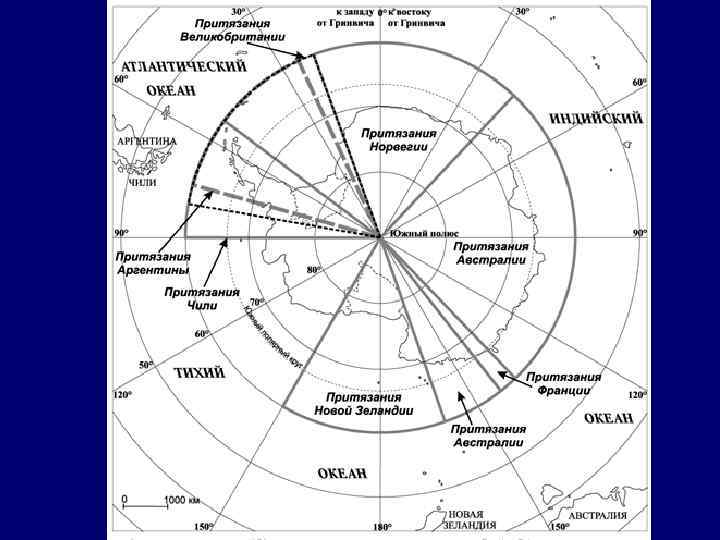 Антарктида В соответствии с конвенцией об Антарктике, подписанной 1 декабря 1959 года и вступившей в силу 23 июня 1961 года, Антарктида не принадлежит ни одному государству. Разрешена только научная деятельность. Размещение военных объектов, а также заход боевых кораблей и вооружённых судов южнее 60 -го градуса южной широты запрещены. В 1980 -е годы Антарктиду объявили ещё и безъядерной зоной, что исключило появление в её водах судов-атомоходов, а на материке — атомных энергоблоков. Сейчас участниками договора являются 28 государств (с правом голоса) и десятки стран-наблюдателей.