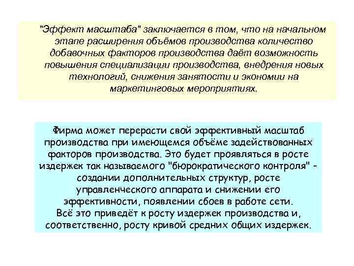 "Эффект масштаба" заключается в том, что на начальном этапе расширения объёмов производства количество добавочных факторов производства даёт возможность повышения специализации производства, внедрения новых технологий, снижения занятости и экономии на маркетинговых мероприятиях. Фирма может перерасти свой эффективный масштаб производства при имеющемся объёме задействованных факторов производства. Это будет проявляться в росте издержек так называемого "бюрократического контроля" создании дополнительных структур, росте управленческого аппарата и снижении его эффективности, появлении сбоев в работе сети. Всё это приведёт к росту издержек производства и, соответственно, росту кривой средних общих издержек.