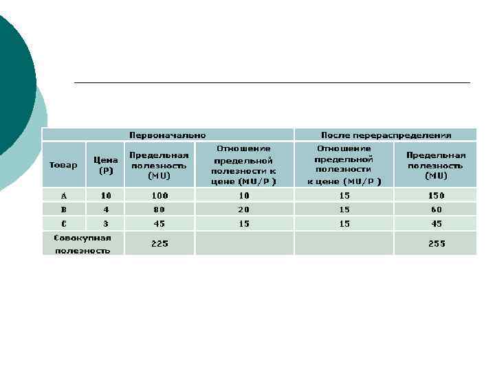 Предположим, что потребитель приобретает три товара А, В и С. Цены этих товаров и предельная полезность каждого из них приведены в левой части таблицы.