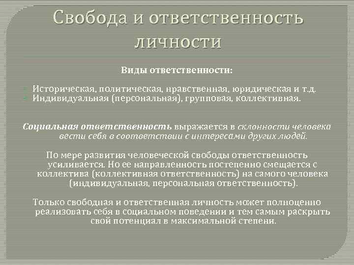 Свобода и ответственность личности Виды ответственности: Историческая, политическая, нравственная, юридическая и т. д. Индивидуальная (персональная), групповая, коллективная. Социальная ответственность выражается в склонности человека вести себя в соответствии с интересами других людей. По мере развития человеческой свободы ответственность усиливается. Но ее направленность постепенно смещается с коллектива (коллективная ответственность) на самого человека (индивидуальная, персональная ответственность). Только свободная и ответственная личность может полноценно реализовать себя в социальном поведении и тем самым раскрыть свой потенциал в максимальной степени.