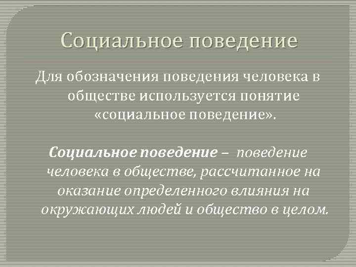 Социальное поведение Для обозначения поведения человека в обществе используется понятие «социальное поведение» . Социальное поведение – поведение человека в обществе, рассчитанное на оказание определенного влияния на окружающих людей и общество в целом.