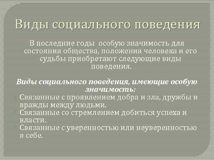 Виды социального поведения В последние годы особую значимость для состояния общества, положения человека и его судьбы приобретают следующие виды поведения. Виды социального поведения, имеющие особую значимость: Связанные с проявлением добра и зла, дружбы и вражды между людьми. Связанные со стремлением добиться успеха и власти. Связанные с уверенностью или неуверенностью в себе.