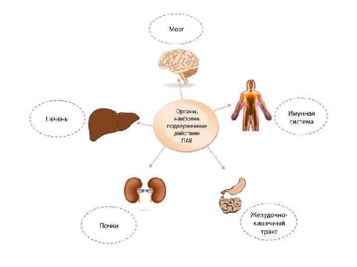Действие на организм • Внутревенное введение растворов ПАВ сопровождается гемолизом (разрушением) эритроцитов. При этом оболочка эритроцитов разрушается или становится проницаемой для гемоглобина, который выходит из них в окружающую среду. Гемолитическое действие ряда гомологов жирных сульфатов и алкилдиметилбензиламмония хлорида проявляется при концентрациях, более низких по сравнению с критической концентрацией мицеллообразования. Гемолиз, вызываемый ПАВ, задерживается в присутствии холестерина и фосфолипидов. • Введённые в ток крови ПАВы взаимодействуют не только с эритроцитами, но и с другими составными её частями. Так, полиоксиэтиленовый эфир алкилфенола в очень высокой степени повышает фагоцитозное действие лейкоцитов, а сульфонаты лигнина действуют как антикоагулянты.