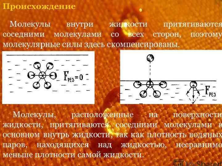Значение поверхностного натяжения • Определяет свойства (например, летучесть) жидкости • Без поверхностного натяжения невозможно было бы писать шариковой ручкой. Паста бы моментально растекалась по бумаге • Играет существенную роль в жизни всех живых существ (перемещение водомерок по поверхности воды, подвешивание личинок комаров за поверхность воды, определение формы клетки, почвенного баланса и т. д. )