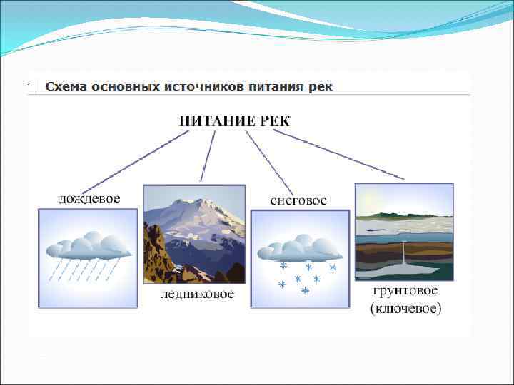 Источники питания рек атмосферные осадки (образуют паводки) таяние снега весной (образует половодье) таяние ледников в горах (образует паводки) сток грунтовых вод (образует базисный речной сток) Чаще всего реки имеют смешанное питание. В различных физико-географических условиях доля отдельных источников питания реки неодинакова.
