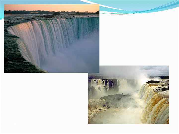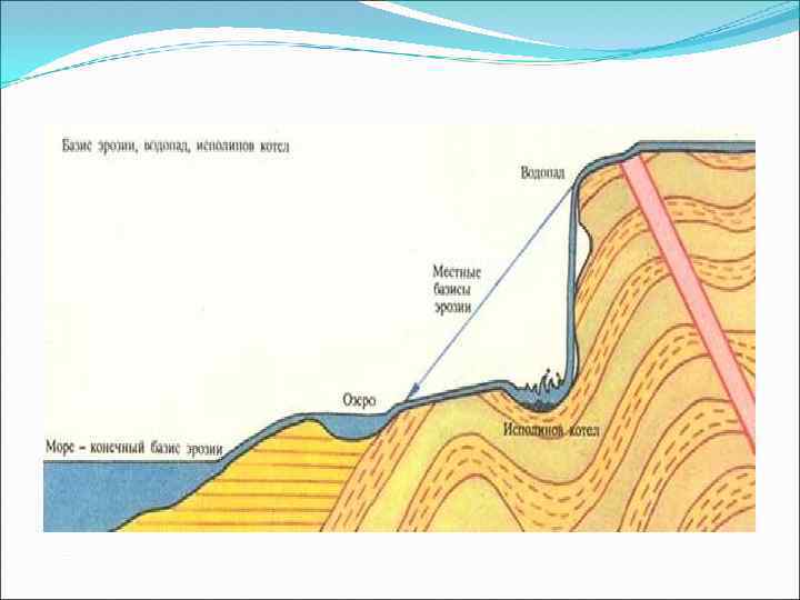 Продольный профиль Река со временем вырабатывает свой продольный профиль кривую, показывающую изменение высоты дна и поверхности воды в реке по мере удаления от устья (истока). Продольный профиль может быть: - выпуклый или сбросовый (характерен для молодых рек, например рек Кольского полуострова) имеет в верхнем течении уклоны меньше, чем в нижнем течении, усилена донная эрозия в нижнем течении, - прямолинейный (характерен для достаточно зрелых рек) - вогнутый (характерен для равнинных рек в стадии старости, имеет в верхнем течении большие уклоны, чем в нижнем)- профиль равновесия. В верхнем течении преобладает размыв - донная эрозия, а в нижнем - аккумуляция наносов и боковая миграция русла - боковая эрозия. В среднем течении преобладает транзит наносов. - ступенчатый (имеет резкие изменения отметок русла на отдельных участках - водопады, стремнины, падуны, пороги, характерен для рек, имеющих выступы кристаллического фундамента в русле), например, реки Африки.