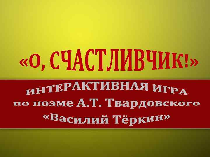 ОТБОРОЧНЫЙ ТУР «Кто стрелял? » «Баян» В поэме Назовите главы из «Василий Тёркин» поэмы Правиглавы с таким А. Т. Твардовского льно! названием нет! «Василий Тёркин» «Переправа» «Два солдата» «О награде» «Дуэль» Игра «О, счастливчик!» начинается!