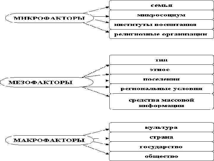 А. В. МУДРИК ВЫДЕЛИЛ ОСНОВНЫЕ ФАКТОРЫ СОЦИАЛИЗАЦИИ, ОБЪЕДИНИВ ИХ В ТРИ ГРУППЫ: макрофакторы (космос, планета, мир, страна, общество, государство), которые влияют на социализацию всех жителей планеты или очень больших групп людей, живущих в определенных странах; мезофакторы - условия социализации больших групп людей, выделяемых по национальному признаку (этнос как фактор социализации); по месту и типу поселения, в котором они живут (регион, село, город, поселок); по принадлежности к аудитории тех или иных сетей массовой коммуникации (радио, телевидение, кино и др. ); микрофакторы, к ним относятся те, которые оказывают непосредственное влияние на конкретных людей: семья, группы сверстников, микросоциум, организации, в которых осуществляется социальное воспитание - учебные, профессиональные, общественные и др.