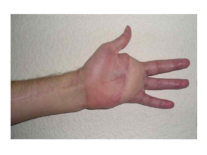 Перелом основания кисти • Перелом основания первой пястной кости бывают внутрисуставные и внесуставные или поперечные. Пациент жалуется на боли в области перелома. • Первый палец согнут и прижат к ладони. Обычно возникает выраженный отек и припухлость в зоне повреждения. При прощупывании перелома боли резко усиливаются и можно прощупать отломок в области «анатомической табакерки» . Если небольшой треугольный осколок первой пястной кости остается на месте, а кость вывихивается в сторону лучевой кости, такой перелом называется перелом Беннета