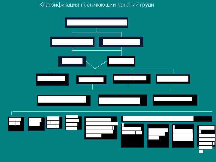 Классфикация ранениий и поверждений груди по Б. В. Петровскому I. II. Закрытые повреждения груди Открытые повреждения груди - Проникающие - Непрониающие III. Торакоабдоминальные ранения IV. Ранения сердца, перикарда, крупных сосудов средостения.