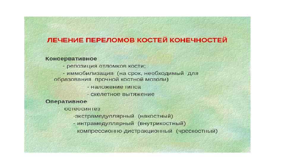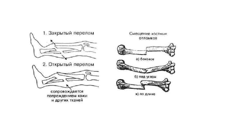 клиника • резкая боль, усиливающаяся при любом движении • нарушение ее функции • отек в месте перелома • укорочение конечности • патологическая (ненормальная) подвижность кости • При пальпации области перелома — резкая боль, нередко костная крепитация • При открытом переломе в ране видны отломки костей, могут выступать