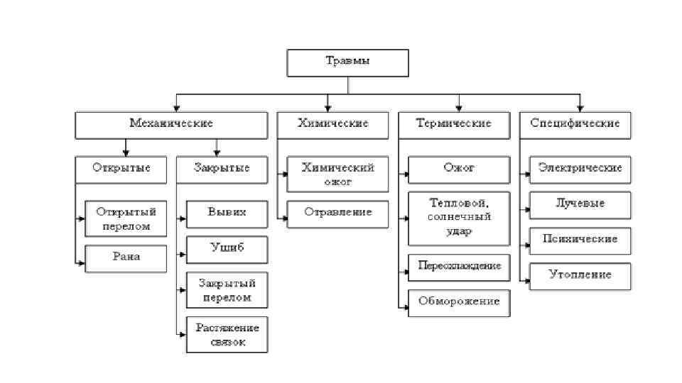• По степени тяжести различают: • 1) Легкие травмы (растяжения, ушибы). • 2) Средней тяжести (вывих плеча). • 3) Тяжелые (перелом обеих голеней). • 4) Крайне тяжелые травмы (они несовместимы с жизнью).