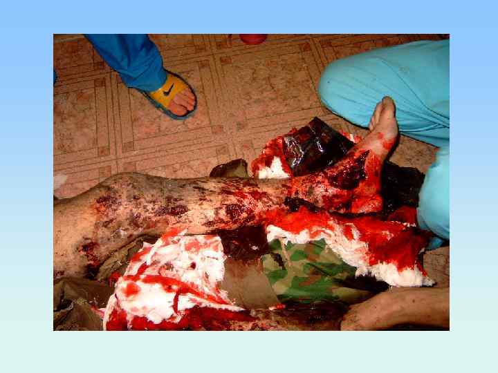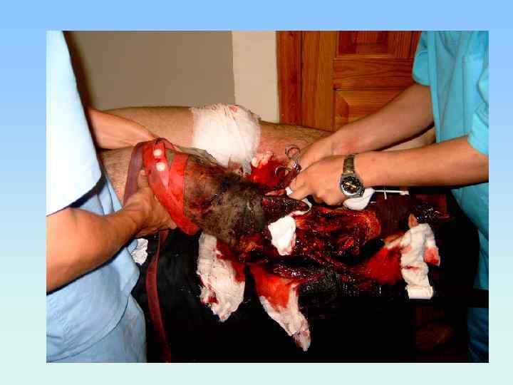 Первая врачебная помощь • контроль наложенных жгутов, повязок и шин, при необходимости их исправление и наложение новых, • обезболивание переломов (по возможности новокаиновые блокады), • введение антибиотиков, • проведение противошоковых мероприятий (объем их зависит от обстановки), • введение ППС и анатоксина, • отсечение полностью разрушенной, висящей на лоскуте конечности.
