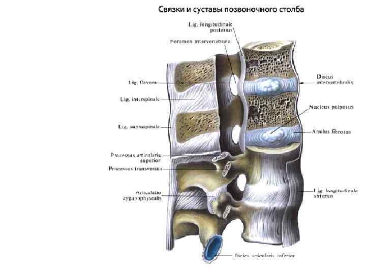Анатомо-физиологические особенности • Костно-связочный аппарат • а) межпозвонковые диски - амортизаторы (снижают давление и нагрузки на спинной мозг) • б) связки (надостистые, межостистые, желтая, передняя продольная)