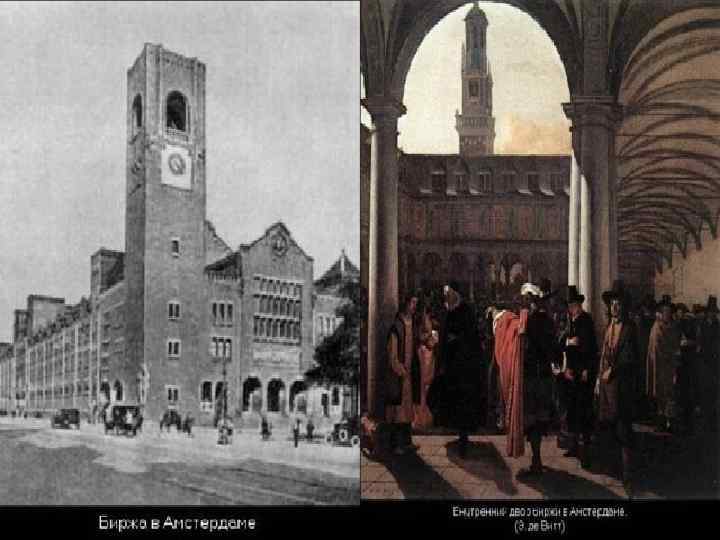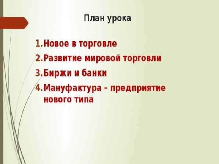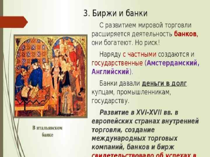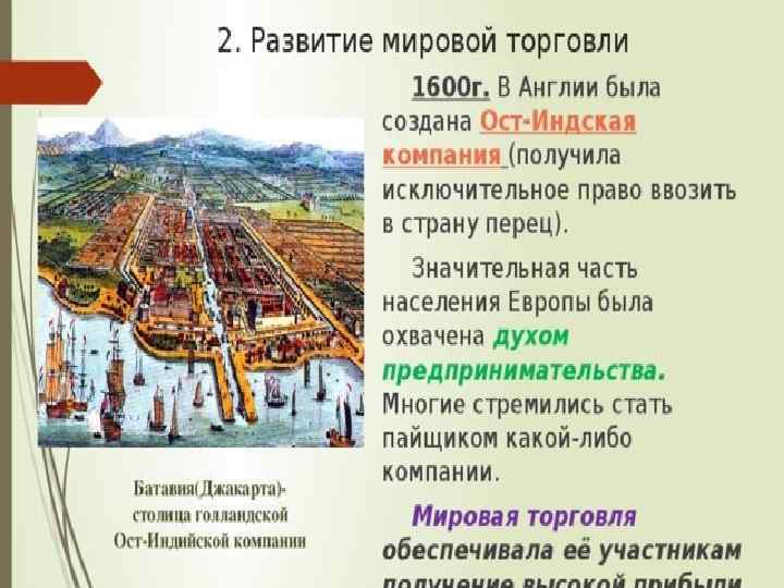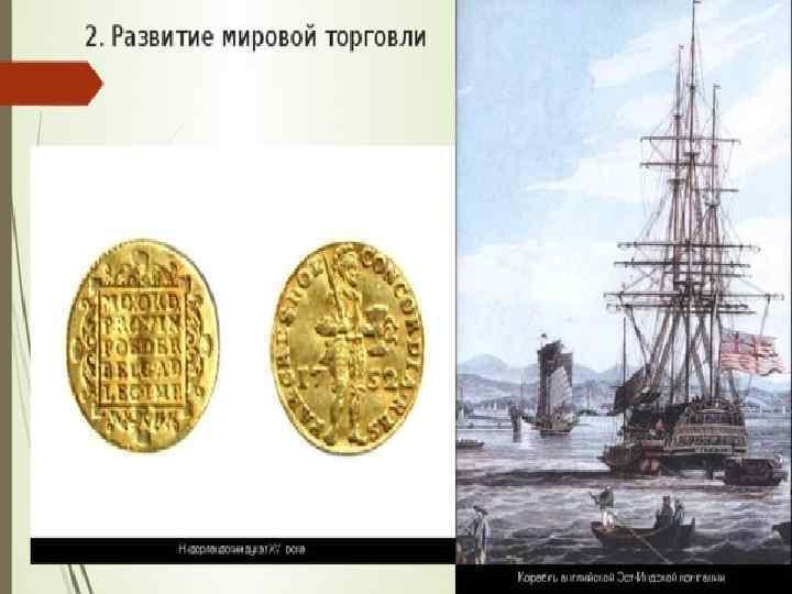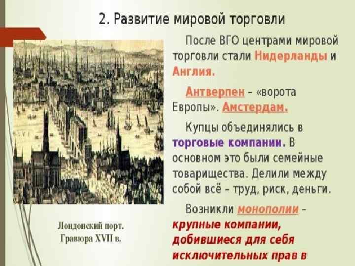 Великие географические открытия Развитие Мировая торговля (Англия и Голландия) Ремесло Сельское хозяйство Новые формы предпринимательской деятельности 1. Появление торговых компаний, занимающихся международной торговлей. 2. Приобретение торговыми компаниями монополий (исключительное право на что-либо). 3. Стремление людей стать пайщиками торговых компаний. 4. Появление бирж – мест для заключения торговых сделок. 5. Развитие банковского дела. Создание гос. банков (Амстердамский и Английский). 6. Упадок ремесленных мастерских, появление мануфактур.