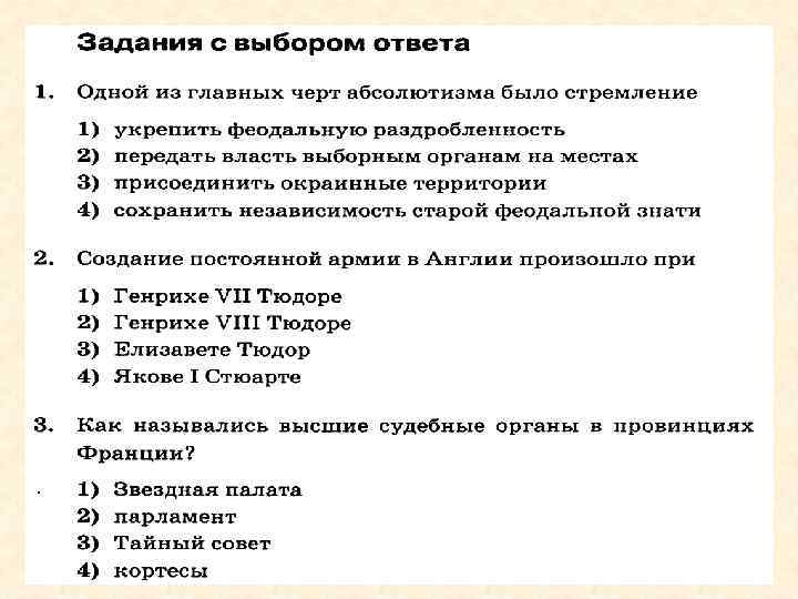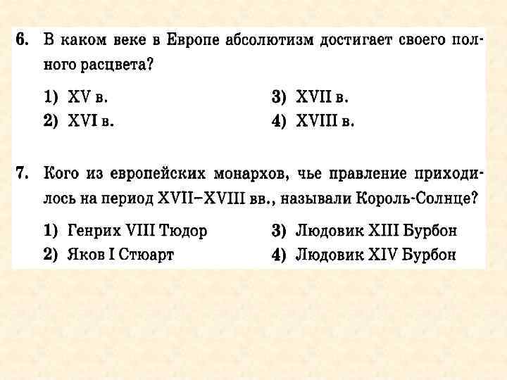 Повторение: Абсолютизм – форма правления, при которой власть неограниченно принадлежит одному лицу – монарху. Черты: 1. Создание общегосударственного аппарата управления, состоящего из чиновников; 2. Формирование постоянной профессиональной армии. 3. Создание государственной налоговой системы; 4. Введение единого законодательства и административного устройства, единых мер и весов; 5. Образование государственной церкви; 6. Проведение единой государственной экономической политики. 1