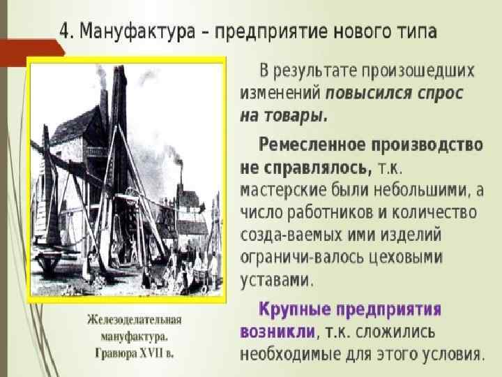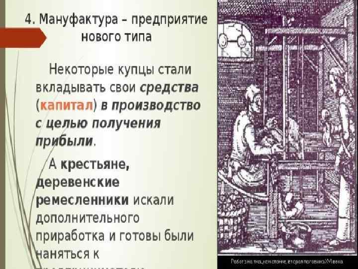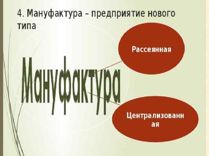 Словарь: Централизованная мануфактура – тип мануфактуры, когда работники трудятся в одном помещении.