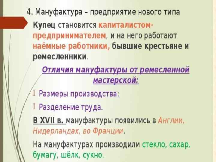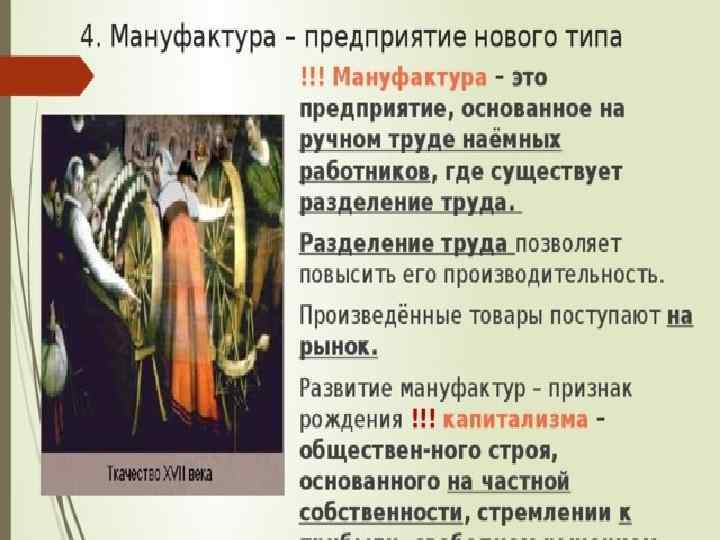 Словарь: Мануфактура - крупное предприятие, основанное на разделении труда и ручной технике.