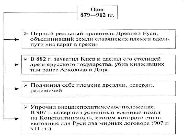 5. Создание единого государства Русь 882 г. – князь Олег (879 -912) собрал большое войско и предпринял поход на юг (Смоленск, Любеч, Киев) Основную часть его дружины составляли варяги Подойдя к Киеву, где князьями были Аскольд и Дир. Олег заманил их к своим ладьям и объявил им: «Вы неста кнѧзѧ ни роду кнѧжѧ, но азъ єсмь роду кнѧжѧ» Предъявив наследника Рюрика, малолетнего Игоря, Олег убил Аскольда и Дира Убийство Аскольда и Дира 2/12/2018