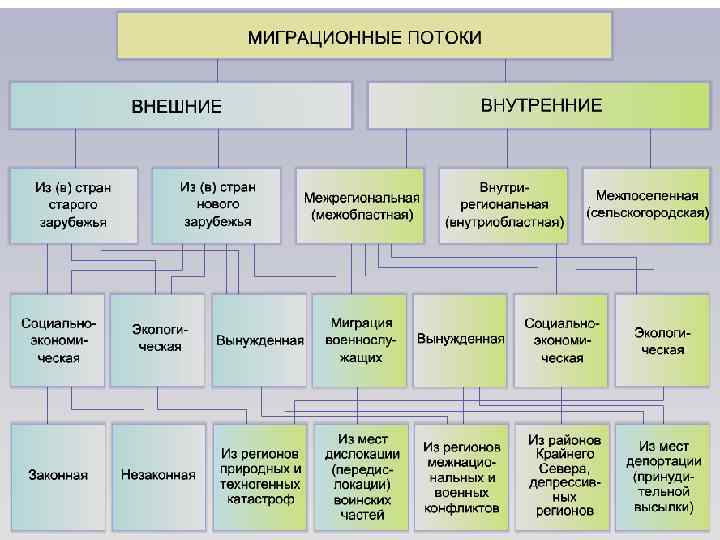 Внешние миграции связанны с переселением из одной страны в другую. Внутренние миграции происходят в пределах одной страны.
