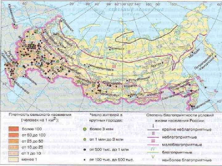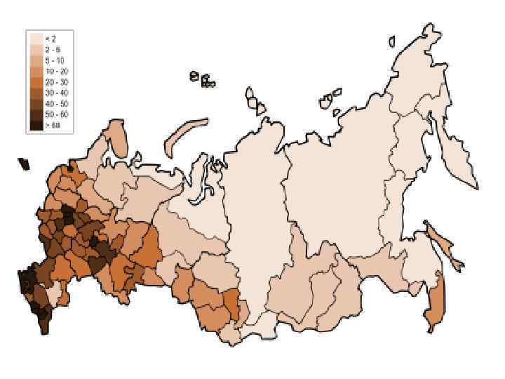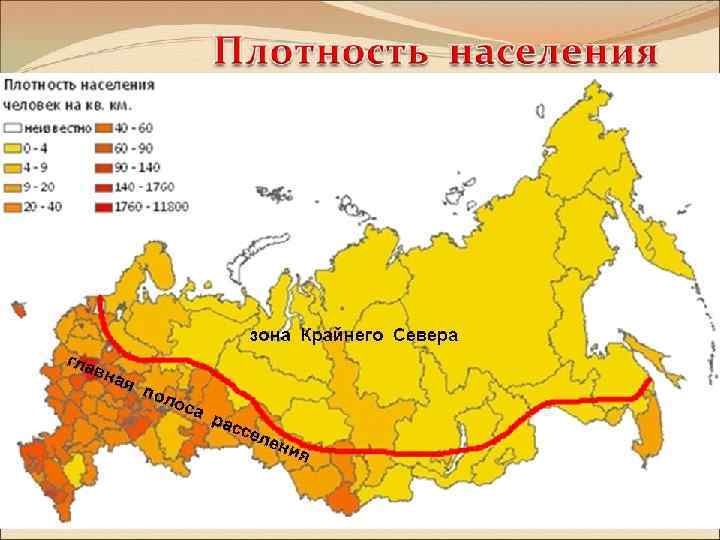 В России внутренние различия в плотности населения очень велики. В европейской части она немного меньше среднемировой — 30 человек на 1 км 2, а в азиатской части — в 10 раз ниже. На отдельных территориях плотность населения достигает Москва 4857, 66 чел /км (а в центральной части Красноярского края она в 1, 21 чел/км , Чукотский автономный округ 0, 07 чел/км , Кемеровская область28, 47 чел/км Средняя РФ 8, 54 чел/км Главная причина подобных различий — неравномерное размещение населения по территории страны. Из всех огромных российских пространств заселено всего 45%. Причем если европейская часть страны заселена на 87%, то азиатская — лишь на 30%. Еще больше различия в заселенности отдельных районов России. В Центральном районе доля заселенной территории — 100% , а на Дальнем Востоке она составляет лишь 1/5 от общей площади.