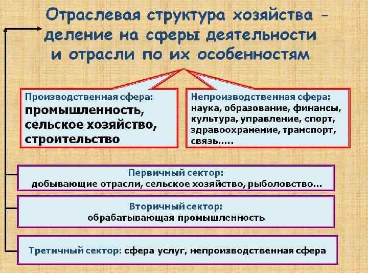 3 сектора. I сектор объединяет все отрасли, деятельность которых связана с эксплуатацией природы: добыча полезных ископаемых, сельское и лесное хозяйство, рыболовство. II сектор слагают отрасли, перерабатывающие сырье, получаемое из I сектора (металлургия, химическая, легкая промышленность и др. ). III сектор — сфера услуг: транспорт, связь, наука, образование