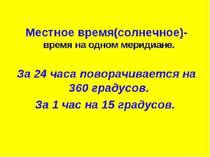 Местное время(солнечное) время на одном меридиане. За 24 часа Земля поворачивается на 360 градусов. За 1 час на 15 градусов. 1 градус = 4 мин