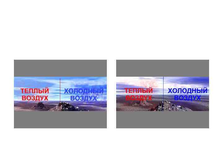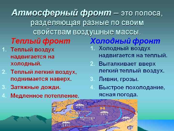 При перемещении теплых воздушных масс в сторону холодных образуется теплый фронт, а при перемещении холодных воздушных масс в сторону теплых — холодный фронт.