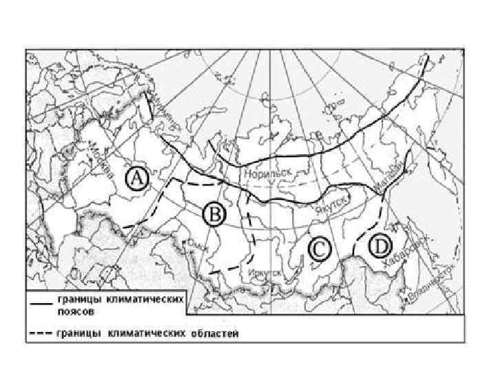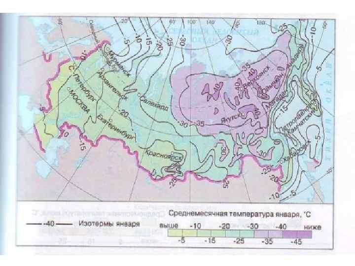 В каком из обозначенных буквами на карте России пунктов средние температуры января самые низкие?