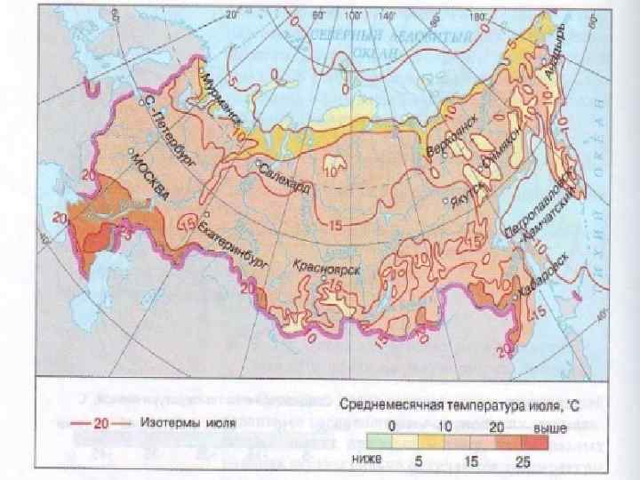 Факторы, определяющие климат России На формирование климата любой территории оказывают влияние следующие факторы: 1) географическая широта, 2) солнечная радиация, 3) циркуляция воздушных масс, 4) подстилающая поверхность, 5) рельеф (высота местности над уровнем моря, направление горных хребтов), 6) близость морей и океанов, 7) морские течения, 8) антропогенные воздействия. Все эти климатообразующие факторы действуют и на территории нашей страны, формируя своеобразные климатические условия того или иного места (региона). Основными климатическими показателями являются: количество тепла, количество осадков и распределение их по сезонам года, испаряемость, коэффициент увлажнения