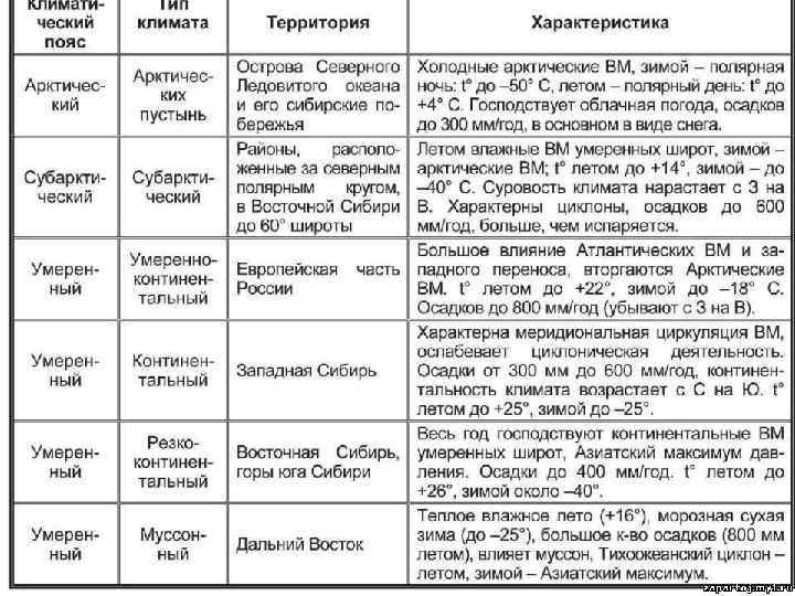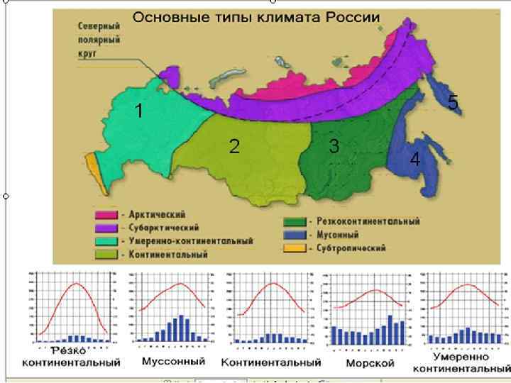 Территория России расположена в 4 климатических поясах. В каждом из них формируется определенный тип климата. В пределах умеренного пояса выделяют климатические области со своими типами климатов. Арктический пояс Субарктический пояс 1 2 1. 2. 3. 4. Умеренный пояс 3 Умеренно континентальный тип Континентальный тип Резко континентальный тип Муссонный тип 4