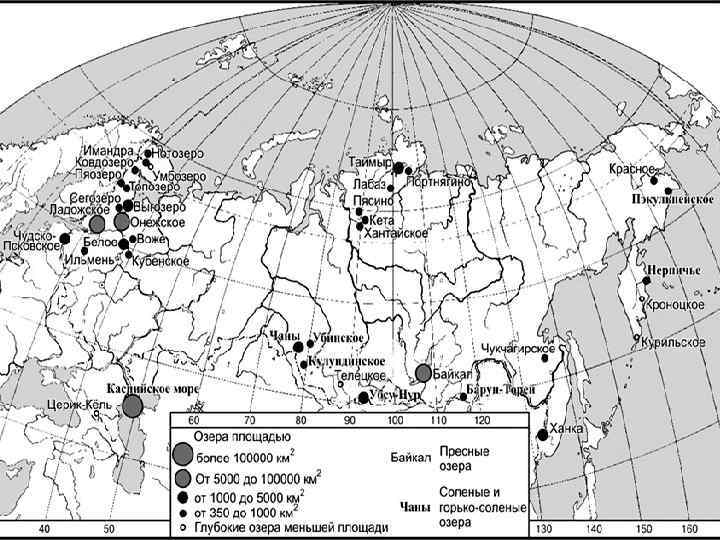 происхождение озерных котловин Ледниковое Озера северо-запада Русской равнины. Ладожское, Онежское, Селигер, Ильмень, Имандра, Псковское, Чудское; севера Сибири - Таймыр Тектоническое Озера горных районов юга Сибири – Байкал Вулканическое Озера Камчатки – Курильское, Кроноцкое, Карымское, Кислотное Остаточное Озера – Каспийское, Чаны, Ханка