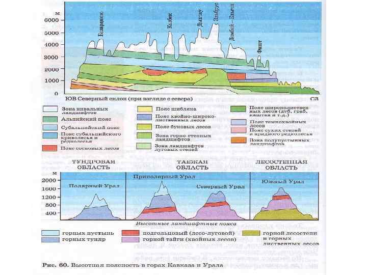 Наибольшее число высотных поясов можно наблюдать в горах, расположенных в тропиках, наименьшее — в горах такой же высоты, как в районе Полярного круга. Характер высотной поясности меняется в зависимости от экспозиции склона, а также по мере удаления гор от океана. В горах, расположенных близ морских побережий, преобладают горно лесные ландшафты. Для гор в центральных районах материка типичны безлесные ландшафты. Каждый высотный ландшафтный пояс окружает горы со всех сторон, но система ярусов на противоположных склонах хребтов может резко отличаться. Только у горных подножий условия близки к типичным для соседних равнин. Над ними расположены «этажи» с более суровой природой. Выше всех располагается ярус вечных снегов и льдов. Чем выше, тем холоднее. Но бывают исключения. В Сибири есть районы, где климат подножий суровее, чем на вышележащих склонах. Связано это с застоем холодного воздуха на дне межгорных котловин. Набор высотных поясов тем больше, чем южнее находятся горы. Очень хорошо это видно на примере Урала. На юге Урала, где высоты меньше, чем на Северном и Полярном Урале, высотных поясов много, а на севере присутствует лишь один горно тундровый пояс (рис. 60).