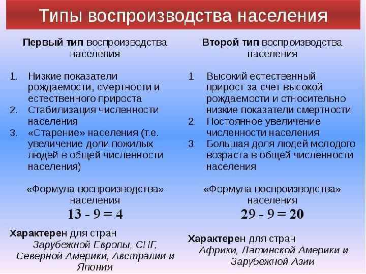 Для России характерен современный тип воспроизводства населения: невысокие показатели рождаемости, смертности, низкий естественный прирост, относительно высокая продолжительность жизни, незначительная доля детей в структуре населения.