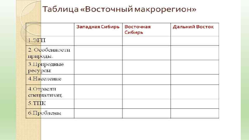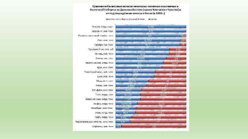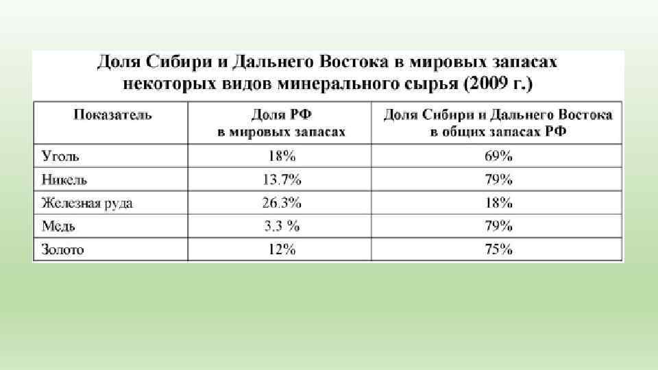 Природные ресурсы. В недрах Сибири и Дальнего Востока сосредоточены огромные запасы природных ресурсов: 85% энергоресурсов и древесины, 75% запасов пресных вод, основная масса запасов алмазов, золота, руд цветных и редких металлов. Южная часть региона имеет достаточно пригодный для многоотраслевого сельского хозяйства климат и плодородные почвы. В морях, реках, озерах региона развит рыбный промысел, в лесах — охота.