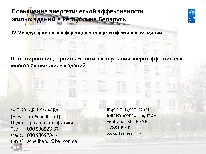 Повышение энергетической Residential Buildings Improving Energy Efficiency in эффективности жилых зданий в Belarus in the Republic of Республике Беларусь IV Международная конференция по энергоэффективности зданий Проектирование, строительство и эксплуатация энергоэффективных многоэтажных жилых зданий Александр Шеллхардт (Alexander Schellhardt) Отдел строительной физики Тел. 030 936923 -37 Факс: 030 936923 -44 E-Mail schellhardt@baucon. de Ingenieurgesellschaft BBP Bauconsulting mb. H Wolfener Straße 36 12681 Berlin www. baucon. de
