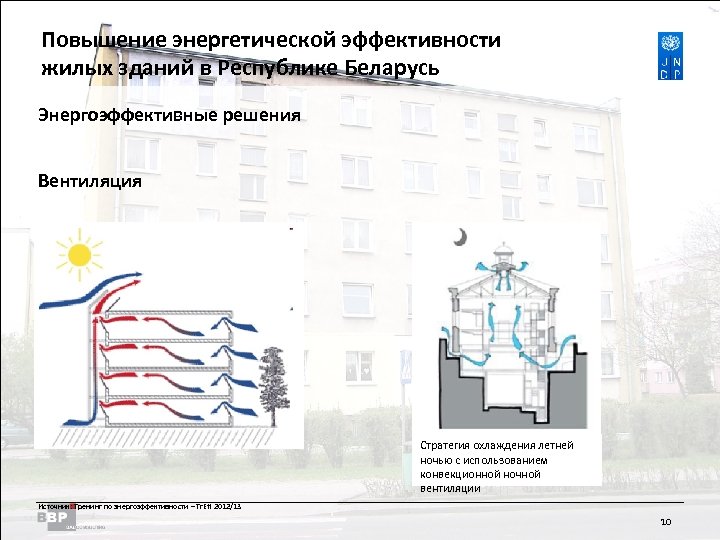 Повышение энергетической Residential Buildings Improving Energy Efficiency in эффективности жилых зданий в Belarus in the Republic of Республике Беларусь Энергоэффективные решения Вентиляция Естественная (пассивная) вентиляция: • Термическая плавучесть основана на том, что внутри здания теплый воздух поднимается вверх. • Разница давлений – это использование эффекта ветра и давления над зданием и около него. Данные способы вентиляции используются в рамках следующих стратегий проектирования: • Солнечная труба • Вентиляционные решетки для вентиляции и затемнения • Окно • Атриумы Механическая (активная) вентиляция включает такие компоненты как вентиляторы, трубопроводы и вытяжные колпаки. В хорошо изолированных зданиях, в особенности в странах с холодным климатом, мы используем систему механической вентиляции с рекуперацией тепла (МВРТ). 9