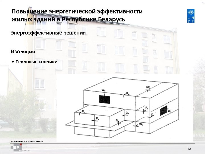 Повышение энергетической Residential Buildings Improving Energy Efficiency in эффективности жилых зданий в Belarus in the Republic of Республике Беларусь Энергоэффективные решения Изоляция • Тепловые мостики Source: DIN EN ISO 14683: 1999 -09 13