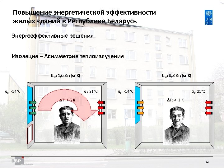 Повышение энергетической Residential Buildings Improving Energy Efficiency in эффективности жилых зданий в Belarus in the Republic of Республике Беларусь Энергоэффективные решения Изоляция – Асимметрия теплоизлучения Uw: 1, 6 Вт/(м²K) qe: -14°C Uw: 0, 8 Вт/(м²K) qi: 21°C DT: > 5 K qe: -14°C qi: 21°C DT: < 3 K 14