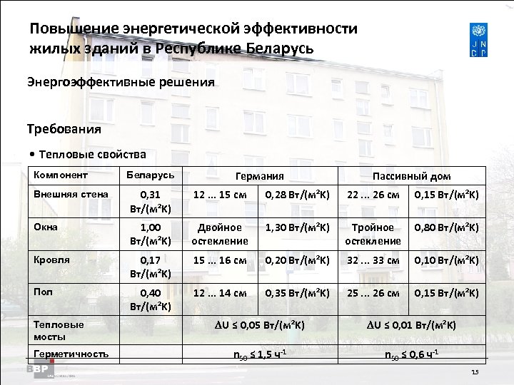 Повышение энергетической Residential Buildings Improving Energy Efficiency in эффективности жилых зданий в Belarus in the Republic of Республике Беларусь Энергоэффективные решения Требования • Тепловые свойства Компонент Беларусь Германия Пассивный дом Внешняя стена 0, 31 Вт/(м²K) 12. . . 15 см 0, 28 Вт/(м²K) 22. . . 26 см 0, 15 Вт/(м²K) Окна 1, 00 Вт/(м²K) Двойное остекление 1, 30 Вт/(м²K) Тройное остекление 0, 80 Вт/(м²K) Кровля 0, 17 Вт/(м²K) 15. . . 16 см 0, 20 Вт/(м²K) 32. . . 33 см 0, 10 Вт/(м²K) Пол 0, 40 Вт/(м²K) 12. . . 14 см 0, 35 Вт/(м²K) 25. . . 26 см 0, 15 Вт/(м²K) Тепловые мосты Герметичность DU ≤ 0, 05 Вт/(м²K) DU ≤ 0, 01 Вт/(м²K) n 50 ≤ 1, 5 ч-1 n 50 ≤ 0, 6 ч-1 15
