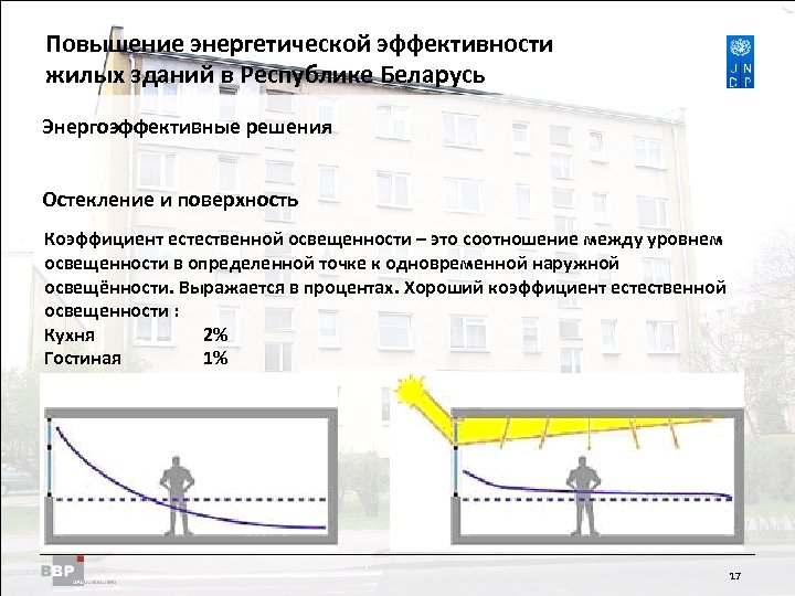 Повышение энергетической Residential Buildings Improving Energy Efficiency in эффективности жилых зданий в Belarus in the Republic of Республике Беларусь Энергоэффективные решения Остекление и поверхность Коэффициент естественной освещенности – это соотношение между уровнем освещенности в определенной точке к одновременной наружной освещённости. Выражается в процентах. Хороший коэффициент естественной освещенности : Кухня 2% Гостиная 1% bed room 0, 5% 17