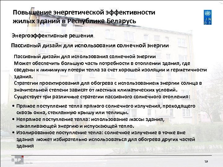 Повышение энергетической Residential Buildings Improving Energy Efficiency in эффективности жилых зданий в Belarus in the Republic of Республике Беларусь Энергоэффективные решения Пассивный дизайн для использования солнечной энергии Может обеспечить большую часть потребности в отоплении здания, где сведены к минимуму потери тепла за счет хорошей изоляции и герметичности здания. Стратегии проектирования для обогрева с использованием энергии солнца в значительной степени зависят от местных климатических условий. Существует три различные стратегии пассивного солнечного отопления: • Прямое поступление тепла прямого солнечного излучения, проходящего сквозь окна, стеклянную крышу или теплицы. • Непрямое поступление тепла: использование массы здания, накапливающей энергию и испускающей тепло. • Изолированное поступление тепла: солнечное излучение в точке вне здания может избирательно использоваться для обогрева других частей здания 18