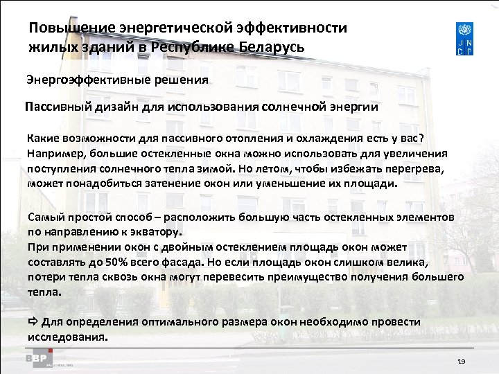 Повышение энергетической Residential Buildings Improving Energy Efficiency in эффективности жилых зданий в Belarus in the Republic of Республике Беларусь Энергоэффективные решения Пассивный дизайн для использования солнечной энергии Какие возможности для пассивного отопления и охлаждения есть у вас? Например, большие остекленные окна можно использовать для увеличения поступления солнечного тепла зимой. Но летом, чтобы избежать перегрева, может понадобиться затенение окон или уменьшение их площади. Самый простой способ – расположить большую часть остекленных элементов по направлению к экватору. При применении окон с двойным остеклением площадь окон может составлять до 50% всего фасада. Но если площадь окон слишком велика, потери тепла сквозь окна могут перевесить преимущество получения большего тепла. Для определения оптимального размера окон необходимо провести исследования. 19