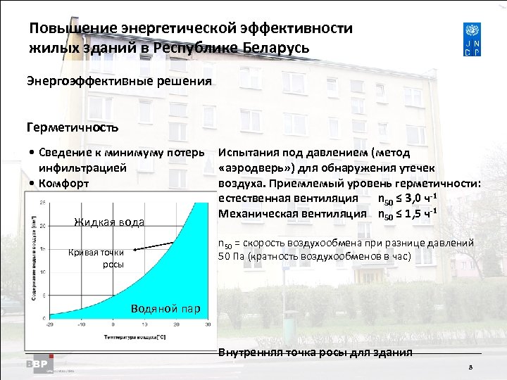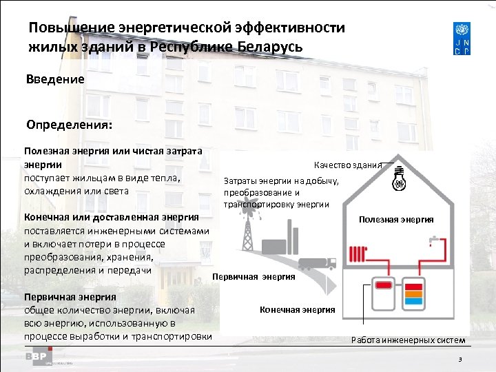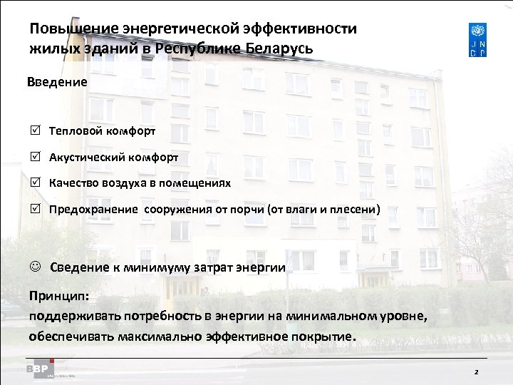 Повышение энергетической Residential Buildings Improving Energy Efficiency in эффективности жилых зданий в Belarus in the Republic of Республике Беларусь Введение R Тепловой комфорт R Акустический комфорт R Качество воздуха в помещениях R Предохранение сооружения от порчи (от влаги и плесени) J Сведение к минимуму затрат энергии Принцип: поддерживать потребность в энергии на минимальном уровне, обеспечивать максимально эффективное покрытие. 2