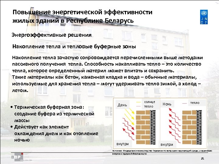Повышение энергетической Residential Buildings Improving Energy Efficiency in эффективности жилых зданий в Belarus in the Republic of Республике Беларусь Энергоэффективные решения Накопление тепла и тепловые буферные зоны Накопление тепла зачастую сопровождается перечисленными выше методами пассивного получения тепла. Способность накапливать тепло – это количество тепла, которое определенный материл может впитать и сохранить. Такие материалы как бетон, каменная кладка и вода – обычные материалы, используемые для хранения тепла – могут удерживать тепло зимой, а холод – летом. • Термическая буферная зона: создание буфера из термической массы • Действует как элемент охлаждения днем и как отопление ночью День внутри солнце тепло Ночь тепло внутри Источник: Федеральное министерство Германии по вопросам окружающей среды, сохранению энергии и ядерной безопасности 21